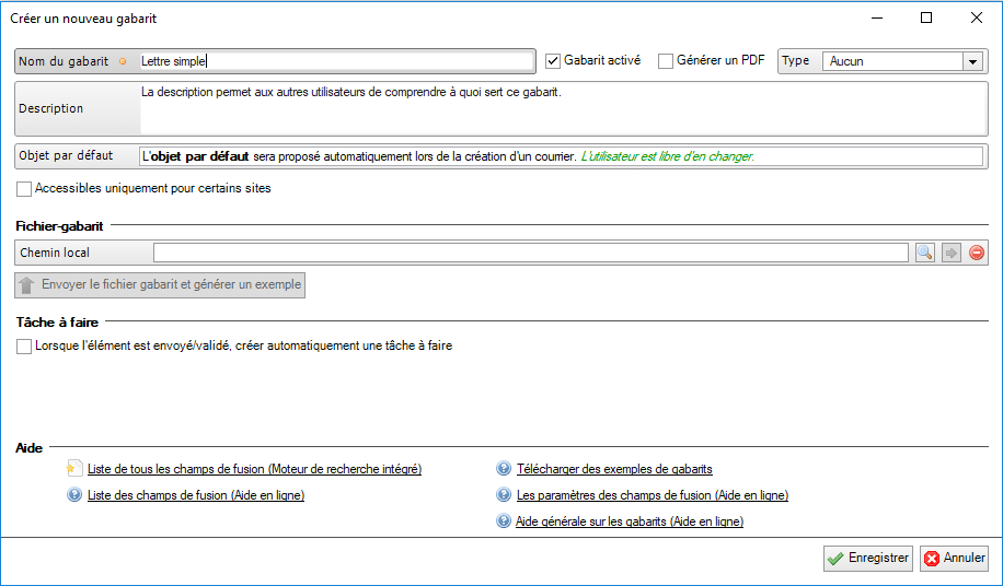 - Indiquer la Description du gabarit. La description est un texte cours qui explique la finalité du gabarit.