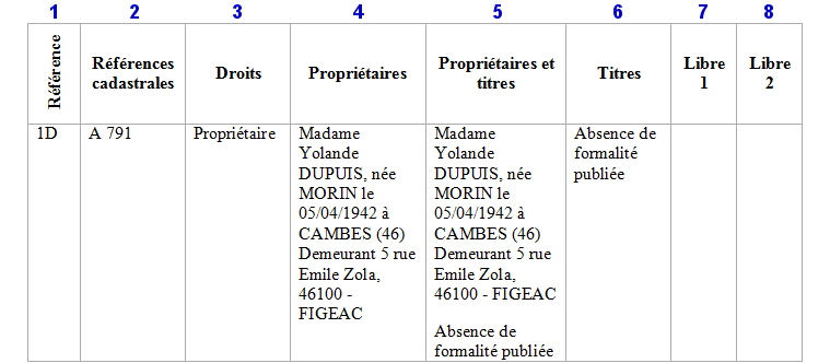 - La colonne Références cadastrales (2) indique les numéros de parcelles du compte associé.