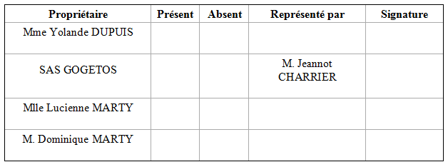 Le champ de fusion Affaire.GE.PVBorn.TablSign2 liste les participants du bornage, 1 par ligne, avec la notion de présence ou d’absence. Exemple :