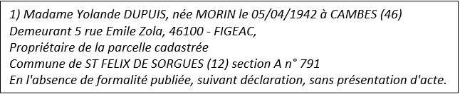 Le champ Affaire.GE.PVBorn.PropDem est remplacé par la liste des propriétaires demandeurs, en toutes lettres. Les états-civils des propriétaires et les titres de propriétés sont repris en précision en fonction des données saisies dans l’onglet Parcelles de l’affaire et présentés selon les recommandations du guide rédactionnel du PV de bornage normalisé.